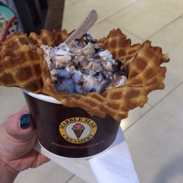 It was hot afternoon and I did not want to overwork my liver so I decided to consume ice cream at Marble Stab Creamery at Bugis+.Consuming ice cream at lunch is not common so there was no crowd at the Marble Stab. It was very quiet. The stall was rather open with 3 tables. There were wide assorted flavours estimated about 24 flavours. There flavours that I noticed were not the fancy name rather it is more of beverage nature such as mocha, thai milk, strawberry, chocolate mint.With so many flavours, choosing the right flavour is a task. I sampled a few flavours and decided the Irish cream ($4.90). I chose this cream as it was more of British nature and it would be rich in cream texture to fill my hunger spank. At last, I had my first cup of Marble Stab ice cream. The store helper gave me more than a single scope. The scope has covered the cup. The plastic spoon was unusual as it has the name – Marble Stab printed. The texture is creamy and it has no feel of icy texture. Irish creamy does not taste like cameral nor coffee or chocolate. It has a mixture of everything. The ice cream is also soft yet it does not melt easily.I enjoyed the Irish cream flavour Marble Stab.…查看更多
