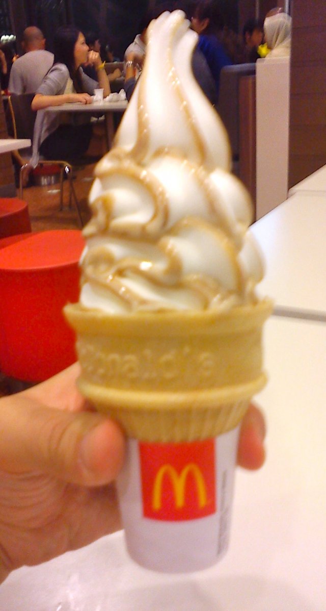 Butterscotch vanilla cone ice-cream, for 80 cents. You could see that the ice cream looks rather weird because the staff did not dispense the ice cream in a circular motion. Instead, she dispense it in a back and forth motion!!! the icre cream being unglam is one thing, another thing is that the amount she dispense out was little too...many eople wonder how butterscotch taste like...it actually taste like caramel coffee. If you like coffee ice cream, you should give it a try:)…查看更多