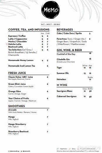 MEMO Cafe (新加坡) 網址: https://s.openrice.com/eKbSB01L7y0W0 地址: Studio M Riverside Hotel Robertson Quay, 3 Nanson Road., Mohammed Sultan, Singapore 電話: +65 6808 8885