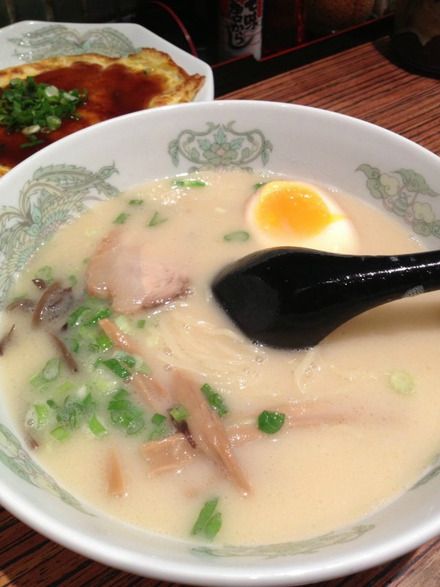 Paitan tonkotsu spicy ramen weekday off peak set for $12.90.We also added the gyoza for $3 for 4 pieces. The gyoza tasted average. The ramen was moderately spicy and it should be rather tolerable for those who can't really take food that are spicy. The egg yolk was soft and runny and the portion of the ramen was good. The off peak set ramens are only available from 3pm-5pm.I had the iced green tea to go with my meal and it was quite bland. Service was quite fast as there was not much people around. 查看更多