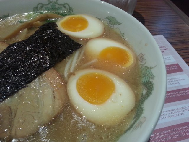 I personally love Men-ichi's ramen but never tried the Shoyu Tonkotsu, or their char siew. The soup is similar to the tonkotsu soup, thick and sweet, and seriously I don't notice the shoyu (soy sauce) taste. The char siew definitely isn't the best ramen char siew I've had. Its the typical fatty char siew served in most Japanese restaurants which I absolutely dislike. However, as usual, the ramen is springy and goes well with the soup. Overall, as a frequent customer, I was disappointed by the ramen. The soup was not too different and I threw away all the char siew after the first bite. Men-ichi has a wide selection of tasty ramen, so I'd recommend something else like Curry Cheese Ramen or Teriyaki Salmon (tonkotsu) ramen. 查看更多