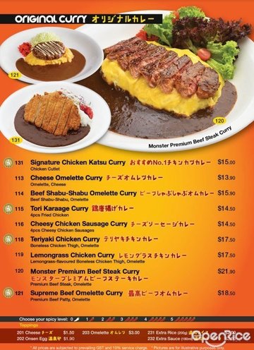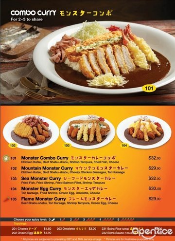 怪物咖哩組合 / 招牌炸雞排咖喱 / 牛肉餅歐姆咖喱飯 / 芝士蛋咖哩 / 高級咖哩牛排