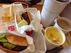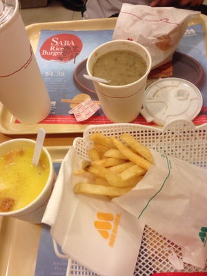 Tonight's menu...Tsukune rice burger $3.90Tsukune is a minced chicken patty topped with onion strips and dipped in special Japanese sauce. This is the first time I'm having this. The chicken was alright but not as tasty as I imagined...still prefer my Ebi burger or Kakiage burger.Hubby's Yakiniku rice burger $3.90Hubby says the beef slices were well marinated and very tender...he likes!Sides, Butterfly prawns 15pcs $8.40Prawns are fresh and batter was nice and crispy...yums.…查看更多