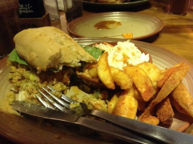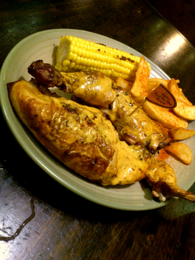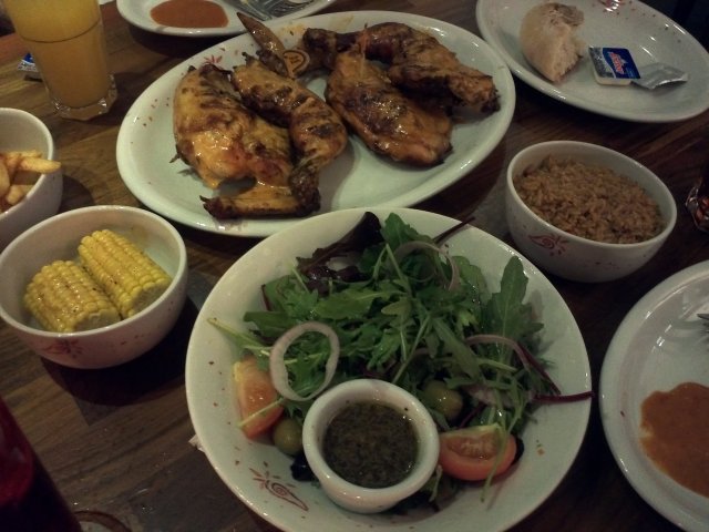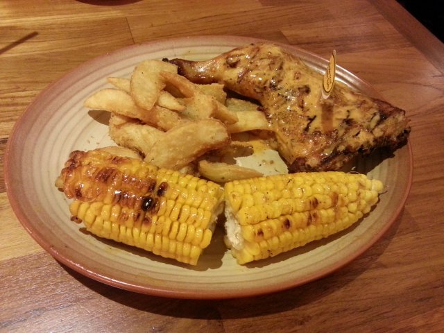 I was craving for Nando's Chicken so I headed to the branch located at Tampines Mall to satisfy my craving. I had to queue for almost 30 minutes before I can get a seat. Perhaps it's Sunday so there is crowd everywhere.We finally got our seats and look through the menu to order. We had difficulties getting attention from the staffs. Maybe because they are short of manpower to handle the full house. We finally settled down with the usual order - 1/4 chicken with 2 sideline dishes @S$13.90. We ordered mild peri-peri chicken.Our sideline was the same. It was sideline were corn on cob and old-styled chips. I do like to stress that they do maintain consistency quality of Nando's chicken regardless from different branches and crowded of people.However, the waiting time is really took sometime. Even request for billing will take ages. I would not recommend to go during peak hours. Not sure does their service improve during off-peak hours or not. But definitely a no good service when i visited them. I need to call 3 staffs before i can finally get my bill settled.…查看更多