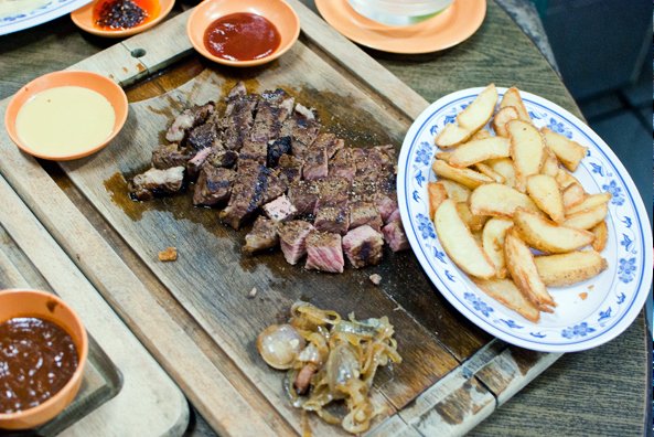 My parents wanted to give me my birthday treat in advanced for me as they would be away in Indonesia for their holidays during my birthday. Hubby suggested going to New Ubin Seafood as he had tried their steak before and he said all the food was great.Hubby made a reservation at 11.30am for 4pax (my brother was in Korea so he couldn't join us) and we reached there slightly earlier when there was no crowd yet. We were given a seat just in front of the water feature on the left.Menu We all ordered lime juices as it was complimentary. Water feature behine us. Fried Mee Special ($12/ S)We could find many sea of goodness here such as baby squids, clams in a thick gravy and topped with lots of lard. We all loved it very much. US Black Angus Ribeye Steak ($12 per 100g/ min 500g), served with caramelized onions, idaho potato wedges on a wooden platter. Condiments include sea salts, ketchup and wasabi sauce. Most people visit this restaurant for the steak. This is a must-order!We had our steak "Medium Well" and it was so flavoursome and juicy! You could feel my happiness as I chewed each cube of steak in my mouth. A plate of fried rice will also be served to you if you ordered the ribeye steak. It was actually fried with the fats from the beef! You can eat this on its own. My dad doesn't take beef, so we ordered Signature Meat Platter for him to share with mum. It consists of Kurobuta Ribs, Chicken Satays and Smoked Duck Breast. ($50/platter) Hong Kong Kailan Special - prepared in two styles. ($12/ S) Overall, it was a great meal! I am missing the steak, the pork ribs and the hokkien mee now. Hope to visit it again to also try their soft boiled egg with foie gras.New Ubin Seafood…查看更多