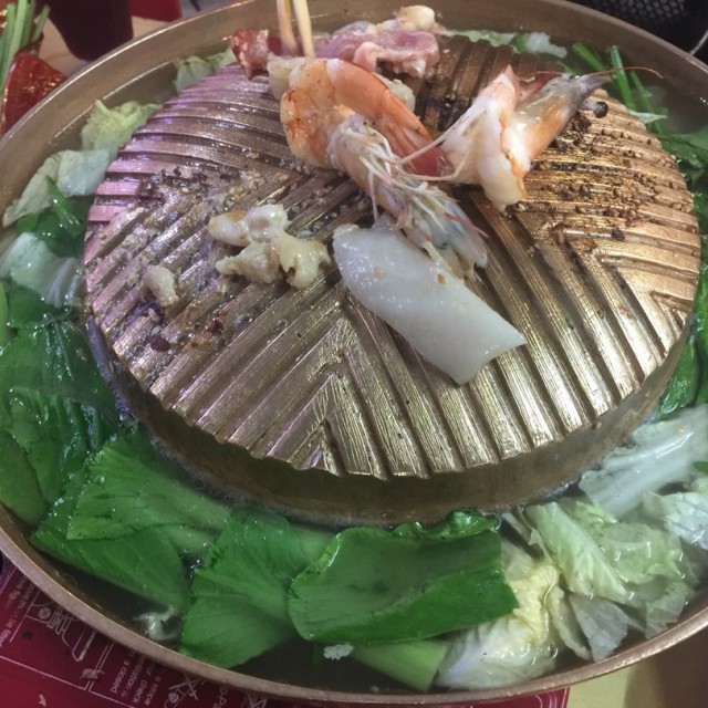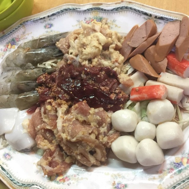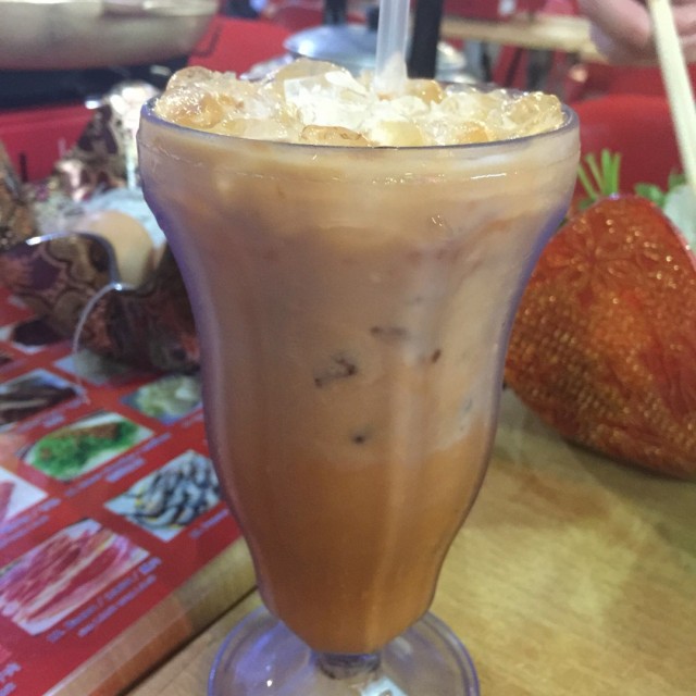 Please go early if you want to eat this, if not you have to queue up! and the people inside eating can just take their own sweet time to finish up their food.This is a set for 2! Which consists of meats, prawns, crab meat, fishball, vegetables, noodles........ !And you can start to BBQ it, it is different from normal steamboat as you can see from how the steamboat thing looks like. The bbq part is in the middle and by the side is the soup area. At the very start, we are given Pork Oil Meat to make the soup tasty by placing it in the middle. And you can start to BBQ your food! (:This is the Thai Teh they have, such unique colours compared to Indian Teh! Yummy, as their ices aren't those big cube but small one (:ENJOY BBQ-ING!