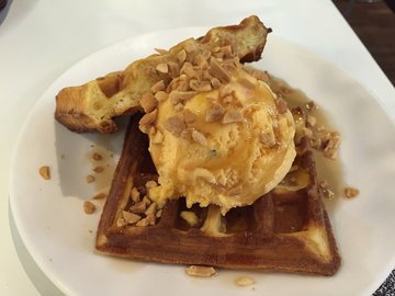 We had our tea break at New Zealand Natural Cafe this afternoon & each of us ordered a waffle with ice cream ($7.50). Although it was stated on the menu that the ice cream is vanilla, but the staff told us that we can actually choose the ice cream flavour ourselves! I had chosen mango passion ice cream to go with the waffle while my colleague chosen berries yoghurt ice cream. The waffles were very yummy (comparable to gelare)! Presentation is nice & looks inviting. What we love most were the crispy waffles, nicely paired with ice cream & honey drizzle & generous nuts sprinkles. Heavenly combination & addictive! =) They also have chocolate lava cake with ice cream which look pretty delicious too. We will definitely go back to try out other desserts/ice cream flavours in future. Thumbs up for their waffle ice cream!