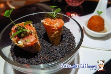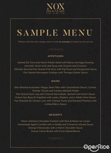 Have you all dine in the dark before? We all heard a fair bit about the concept of dining in the total darkness, haven't we? I think NOX need no further introduction.NOX is located along the shop houses of beach road occupying 2 level of shop space.The service staff welcomed us into the lounge and gave us a drink menu to choose upon. The moment I sat down, the plushy sofa seat reminds me of Gold Class Cinema lounge, quite similar in a sense. Servers explained there is no food menu to choose from, rather there is a secret menu at $88++ per pax that consists of 12 dishes spreaded into 3 courses, appetizers, mains and desserts. Restaurant menu will be change every 6 - 8 weeks and should you have any dietary preference, e.g. vegetarian, please highlight to them.MocktailA citrus combination of orange with a bittersweet finishing taste from a pomelo. Its more sour than sweet per say with grapefruit, lemon juice, simple syrup and Grenadine that give a tart and sweet flavour to the naturally sour fruit.The zesty and minty flavours make this quencher such refreshing. Out of 3 drinks tasted, I rate this the best. Ingredients were close to other drinks with passionfruit, simple syrup, lemon juice, lime juice, fresh mint leave and ginger ale.Being described as not the ordinary strawberry milkshake, it really make me wonder how does it taste like. Drink was milky pink served with little ice cubes and a strawberry. It was more of sweet and less of the sour taste with fresh milk, vanilla syrup, simple syrup, lemon juice and Amaretto Almond Syrup.StartersWe were served with the starters with a vegetarian on the left and 2 mini cones on the right for the non vegetarians. The fried vegetarian had a pleasant scent of truffle oil smell and looks good with its creaming sauce at its base.Starters for the non vegetarian was miniature. Raw salmon was served in the tip of the ice cream cone biscuit added with caviar. The presentation which depicts some plants on the soil had totally taken me away.Before Proceeding into the darknessWe was told not to bring any of our belongings to the dining area and had them kept in the given lockers, not even our handphones or watches with illumination / glow in the dark function. Instagrammers, sorry! For those who needs to go toilet, its best to have the "passage" clear before entering into the darkness.Entering the DarknessWe were quite excited while the door to the dining area swung open and we were greeted by the service staff. Have you wonder how to walk up a flight of steep stairs in total darkness? Well, we conquered the first stage by having 1 hand tapping to each other shoulder in a line and walk up the stair and into the dining.Dining in the darknessIt all started with uneasiness, getting ourselves up at the dining area. When we reached our table, we were led to the back of the chair and have to figure ourselves to take a seat under the clear instructions of course. We were briefed to locate our cutleries (spoon and fork) and the position to place our drinking glass on the table. With every course served, we was told to lean backwards to our chair as these visually impact servers placed the dishes onto our table accurately. Each course consist of 4 dishes served in a wooden tray and placed in a "t" shape. The rule to dine is to start with the dish nearest to ourselves at the "6" needle base on a analog clock and go clockwise.It was a challenge as well as fun locating the dish and place our spoon correctly into our mouth without dropping off the food, afterall this was my 1st time ever dining under such environment. I vividly remembered that our appetizers consist of rocket salad, foie gras, fried calamari, chick peas, lentils etc. While the mains were duck confit, wagyu beef cubes, cod fish. Meat was tender and tasty. Desserts was lava chocolate, popcorn ice cream, lemon sorbet and strudel. Finishing the mealWe stood up and walk a few meters on the carpeted ground using the same "tapping shoulder method" in a line before heading back to the stairs. Luckily the stairs were dimly lit and we could see and walk down under the shades of light. As we proceed back to the lounge, our eyes were tired and as though we had just woke up.We were told to fill up a questionaire to recall and guess what we had eaten. After which, the person in charge will come with an ipad, showing the pictures and naming out the 12 dishes we had. We were surprised by our guesses as it really gave our taste buds a good test.ConclusionAll in all, it was a good 1.5 hours session of experiencing the life of a visually impact human, coping with darkness in their moves. We took our 5 senses daily for granted and being in such environment really gave us a good reminder of how lucky we are to be able to see, hear, touch, taste and feel. Not only that, such dining concept keeps us away from the usual social media / electronics distraction we had during our meals with our friends / partners / families.The only disadvantage here I could ever think of is perhaps not to bring someone here for a first date where you cannot see each other. Ha!We spent about $120 including drinks per pax and reservation is recommended.…查看更多