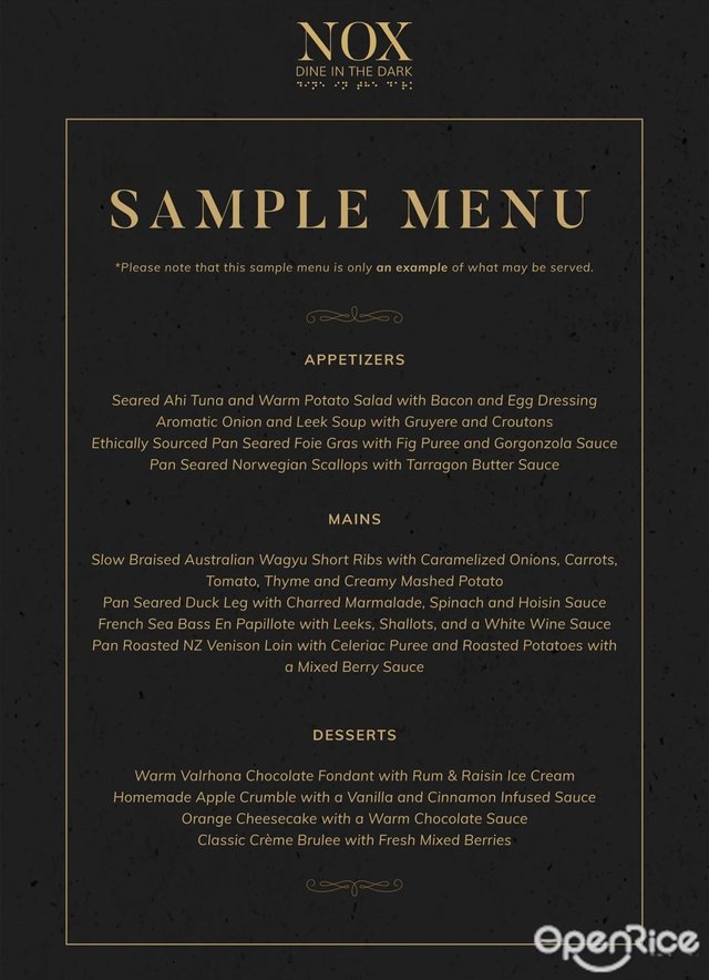 NOX- Dine in the Dark (新加坡) 網址: https://s.openrice.com/eKbSB01q2C100 地址: 83 Club Street, Club Street, Singapore 電話: +65 6298 0708