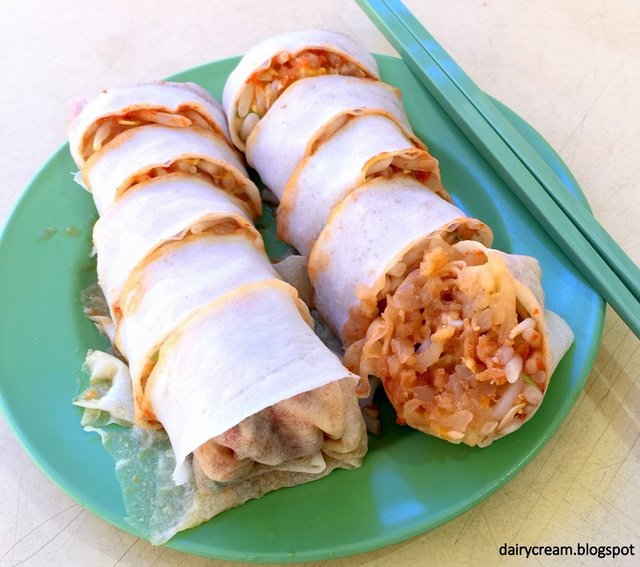 I wondered if the old auntie who took my orders was having a bad morning as she was pulling a glum face. Fortunately, it was another auntie who was rolling the popiah, though each roll turned out smaller than expected. Nitty gritty issues aside, I must confessed that the rolls here are one of the better ones I've had.I doubt it was because I ordered "加辣" as the rolls weren't very spicy. Yet the medley of juices from the braised turnips, sweet sauce and chilli made them extra flavorful.Although bits of soggy skin stuck to the plate, they were supple enough to hold the fillings, yet YIELDING moist and chewy bites. Gritty, juicy with tingling heat beneath the sweetness, each mouthful was a sensation.…查看更多
