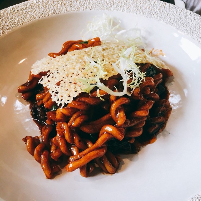 Mangalica Pork Collar, Asian Barbecue Glaze, Corn & Speck Ragout With Pickled Cucumber