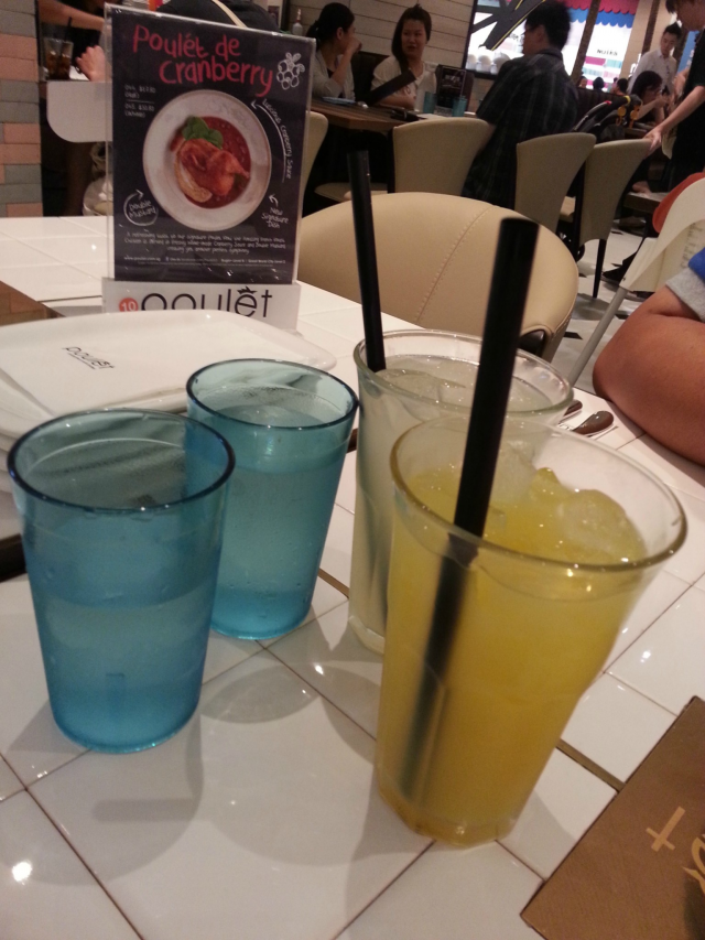 A pocket friendly french cuisine,Poulet, which specialized in roast chicken has swarmed into the F&B industry lately. Poulet belongs to the Thai Express Group similar to New York New York, the previous restaurant in JP (Jurong Point) beofre its opening.As we step into the restaurant, we were greeted with a warming welcome by the Effiel tower. The ambiance of the restaurant kicks off with the streets dinning feel of a french environment, with European kind of streets lamp and cosy corners for dinning. Poulet has simulated an open concept dinning in Jurong Point 2 basement.Top surfacing of the dinning tables are filled with ceramic tiles with the restaurant name Poulet in the middle engrave on a gold plated metal plate.Lime juice and orange juice for our dinner.Cost: S$4.80 eachIntrigued by the french classic, Onion soup I could resist myself but to order a bowl. Generously filled with finely cut onions with small chunks of cheese baked croutons at the top of the soup. A Cost: S$5.80Saucisson comes with marmalade & mustard sauce, evenly pan-fried, a simple dish.Cost: S$6.80Poulet's signature dish, Poulet Roti Half. The distinct aroma immediately engulf my senses when the plate was served. It's light tastiness of the cream sauce together with the fragrance wild mushrooms had immediately bought me over. The half chicken looks crisp on the outside and the skin was perfectly roasted to a golden brown. Cutting the chicken up, it was tender and the bite was made heavenly together in combination of the light cream sauce. Yum Yum! Costs: S$15.80I was surprised initially when the Lamb Shank was served. The portion was generous, unlike those which you usually get elsewhere. Garnish with sauce and carrot, the presentation was eye-pleasing. Taking a sniff of the dish, I could not smell anything unpleasant. Good. As i took my first cut into the meat, I had half expected to use a bit of strength. But it was nothing of the sort, as the tender meat succumbed to the knife. The meat was tender, tasteful and the sauce perfectly complemented the lamb meat. Costs: S$15.80Tasty mashed potato with light cheese tasting is one of the side dish that one can try too.