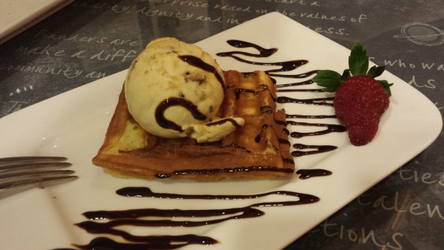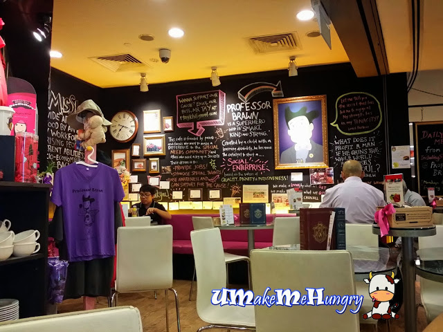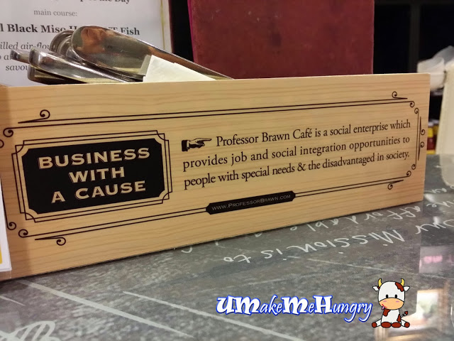 I find it quite meaningful when Professor Brawn Cafe's Business has a cause which is we are actually helping by supporting Social Enterprises to fulfill a social mission of providing employment & social integration opportunities to Persons with Disabilities (PWDs) when we dine.The founders of the cafe are parents and friends who want to make a difference to the special needs community by giving them a suitable job, showcase their talents, also to raise awareness to people around and getting contributions to support the cause. The character of professor brawn was actually created by a children with learning disability. The superhero, professor brawn had characters who is 'smart, kind and strong'.The decors of the cafe had amused me with its welcoming and colourful chalk written wordings on the wall. Not only that, its interior was filled with lively bright colours such that everyone who walked pass will turn their head towards Professor Brawn Cafe.The set dinner (6pm to 9pm) comes with Main course, soup of the day and House Drink. Soup of the day was Calm Chowder. It was served warm, cream based with calm bits and chopped celery (vegetables).The server had gave us a bonus by offering us mushroom soup so that we do not have a repeat in our dinner menu. He was so thoughtful.I like the mushroom soup as they were purely blended with tiny bits of mushroom filled throughout the soup which lends a good mushroom fragrance from every spoonful unlike most of the restaurant, they could have used the premixed powder in preparation of the soup.Drinks was part of the meal and tasted rather standard from the typical syrup mixture with water. They were served in a tall hour glass glass. This was one of the popular Main course for the night beside the enormous Fish & Chips. One glance through the restaurant and you will notice that many had grilled chicken thigh laid on their table. The grilled chicken was cooked to crisp golden brown with some burnt patches. Meat was tender enough and tasted refreshingly sweet with Orange marmalade. The grilled yummy thigh were stacked up on a bed of fluffy mashed potatoes while having salad as the appetizer, dressed sparsely with vinegar.A close up on the chicken leg. Woot Woot! How can I resist? Although I would prefer its rosti to be darker in color than its current faint yellow as seen, the first bite of it had took my taste buds! I thought Marche had the best rosti so far but I was wrong. Their sour cream was lighter, refreshing and left a tangy taste on my buds. The rosti was cramped into a rectangle size, about 1cm in thickness. Yummy!For sausage, there were a few types we can choose from and I had the Swiss Cheese Pork Sausage. I had tried the pork version as I thought it is hard to come by such meat in a westernized cafe when most of them are halal certified. Well, how the taste? It was pleasant, long in length and had a textural bite. Have some privacy dining at a cosy corner in the semi sphere like environment. Just too bad I came to realise this place after I had done with my dinner. Looks like somewhere great to romance a date in a mall after office hours. Ha! What else can I say?Having dined in Professor Brawn Cafe was a killing two birds in one stone matter. It's food is reasonable and had "substance" while service was better than average, thoughtful and polite. It's also good to know that we are helping the needies by dining in Professor Brawn Cafe. Do lend your mouth by helping them to achieve this mission.Do visit http://www.umakemehungry.com/2013/11/professor-brawn-cafe.html…查看更多