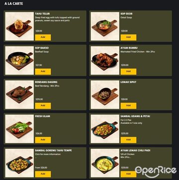 Went all the way to try the talked -about nasi ambeng but was disappointed to be told that nasi ambeng has to be "reserved". So among the selection of food spread, I was toldI cannot order beef rendang, chicken lemak and sambal goreng (why display then)? You all could have prepared extra to serve walk-in customers who're not aware of your pre-order policy. So I ended up ordering whatever leftover that were displayed. The bitter gourd was hard, the spices fried chicken a little hard and the sambal belacan a little sour. Otherwise other dishes that we ordered: chut-chut in lemak, terung belado, begedil, tempeh goreng and paru goreng are tasty. Hope you all can receive criticism and i do hope to come back and see improvement. …查看更多