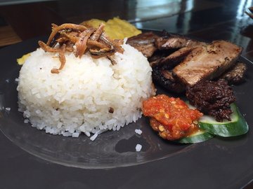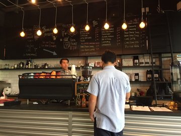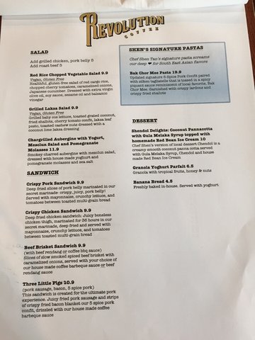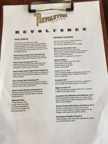 The cafe was located at the ground floor of a office block, just a stone throw away from my work place but no direct public transport to the place. The dine in area was made up of mis-match tables and chairs. Interesting industrial decoration. For a weekday lunch time, the place was pretty empty. Help yourself to the iced water by the counter.Nasi Lemak with 5 Spice Pork Confit (S$9.90)Chef Shen Tan's Signature twice steamed Nasi Lemak (featuring 10 ingredients) served with ikan billis, omelette, housemade sambal and coffee sambal on cool cucumber slices, signature pork confit, marinated with coffee grounds and 5 spice powder.The meat looked rather fatty and charred black, but the taste and texture was just nice. Best to go with the coffee sambal. The housemade sambal was a bit too spicy for me. The ikan billis was quite crispy and crunchy. The rice was pipping hot and fluffy. Shendol Delights : Coconut Pannacotta with Gula Melaka Syrup topped with homemade Red Bean Ice Cream (S$10)Chef Shen's version of local dessert Chendol is a creamy smooth coconut panna cotta served with Gula Melaka Syrup, Chendol and housemade Red Bean Ice CreamThe panna cotta was rich and creamy but it was lacking of the coconut taste. The chendol seemed to be factory made as it stain the brownish syrup to a greenish colour easily. The ice cream was just plain flavoured one without any red bean in it, and with a too icy texture.Flat white ($5.50)Served with latte art. Rich in flavour.…查看更多