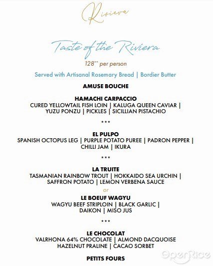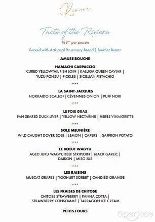 Riviera (新加坡) 網上訂座即賺Rice Dollars 網址: https://s.openrice.com/eKbSB01LJe000 地址: One Fullerton, 1 Fullerton Road, #02-06, Marina Bay, Singapore 電話: +65 6690 7564