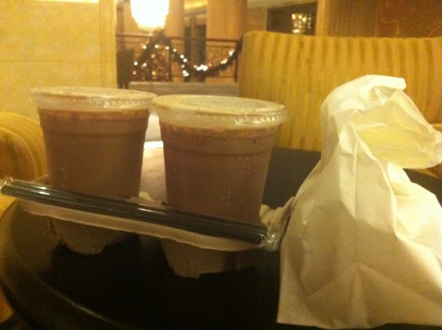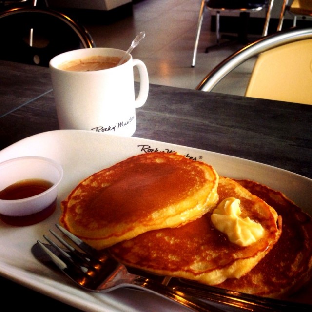 Pancakes served with butter & maple syrup with devil's brew coffee