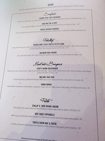 Roosevelt's Diner & Bar is conveniently located right at Outram MRT. There's also an open-air car park that is coupon-based just opposite the cafe, so there's ample parking options should you choose to drive down. This place seems to be catered more towards the expats, for a chill out bar experience but they also have a weekend brunch menu that can suit the needs of any family.1. Pan Seared Hokkaido Scallops ($24) For appetizers, we were recommended to try their scallops, at $8 a pop, I did expect it to be at least decent. The pan seared scallops were served on yuzu mustard ricotta with seaweed brown butter and toasted hazelnuts. The menu mentioned it was topped with tobiko, but we saw no trace of it. The scallops tasted alright, but nothing to wow about, except the price.2. Squid Ink Fish and Chips ($26)An interesting version of the fish and chips that I've not tried before. The exterior of the fish was crisp and had a nice bite, with the addition of the squid ink, it was able to absorb some moisture, leaving the desirable crusty appearance and texture. It was certainly a great surprise for me as I really enjoyed the fish. The chips were slightly limp and soggy, but still acceptable.3. Chicken Confit With Truffle Potato Foam ($26)The chicken skin was thin and crispy. Missing was the layer of fat in between the skin and the melt that had melted away during the cooking process. The chicken melt was tender, juicy and flavourful. Paried with the truffle potato foam, this main dish was the winner for the night. The truffle potato foam had a distinct truffle aroma that wasn't too overpowering, along with the smooth truffle lingering taste that made this dish so addictive. I found myself, digging in, spoon after spoonful of truffle mash!4. BBQ Baby Back Ribs ($26)This was served with a bourbon BBQ sauce and was their signature dish. The portion and price was reasonable and I watched a family of 4 next to us, enjoy this as a family sharing dish.5. Secret Compressed Watermelon waffleInstead of picking a dessert off the menu, owner, Ying recommended us to try one of her newest invention. I was honoured to be her guinea pig.A unique waffle with Strawberry, compressed Watermelon with mint and choya, Balsamic Vinegar Honey and Rose bud ricotta.The compressed watermelon with mint and choya was so juicy and sweet, bursting with flavours. The balsamic honey and rose bud ricotta were all interesting ingredients which sounded like an overdose of ingredient combination. But nope, it all worked out, together. The waffle itself was crispy with a butter fragrance.Overall, decent food with a nice, cosy and chill-out ambience. Great for the boys night out, or family gatherings during the day.…查看更多