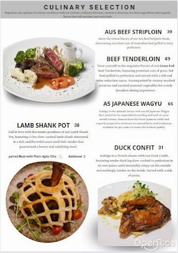 日本新鮮生蠔 / 油封鴨配香煎鵝肝 / 西冷牛肉片沙拉 / 香煎鱈魚 / 草飼牛里脊肉 / 藍帶雞排