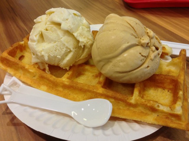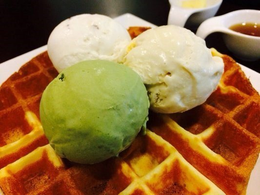 it was yummy!!Then we had a waffle with matcha, rum n raisin and honeycomb. It was my bad for not tasting the flavours before deciding to put them all onto one waffle. The honeycomb was wayyyyy to sweet for my liking.. but the bitterness of the matcha helped save the day.. for 3 scoops on a waffle it was $9.80 and we added 50 cents for butter and syrup