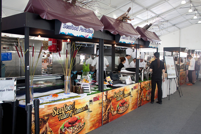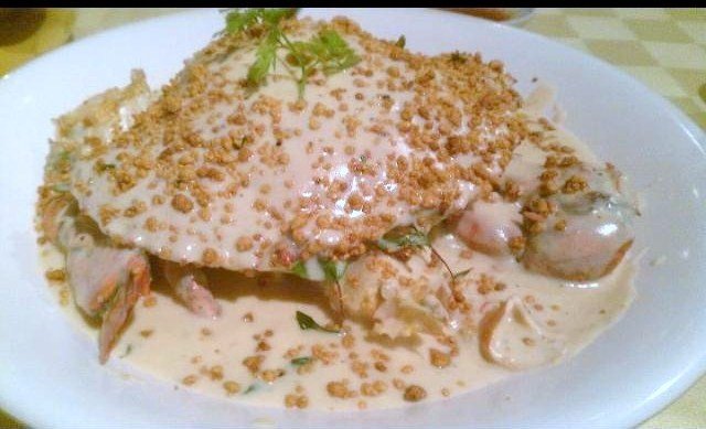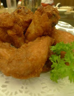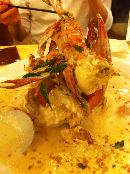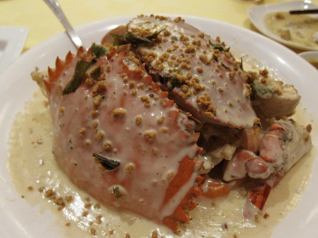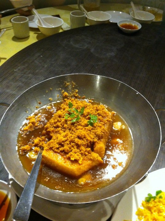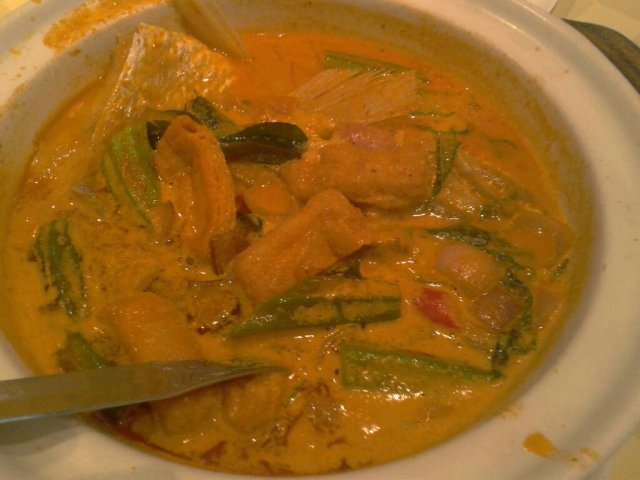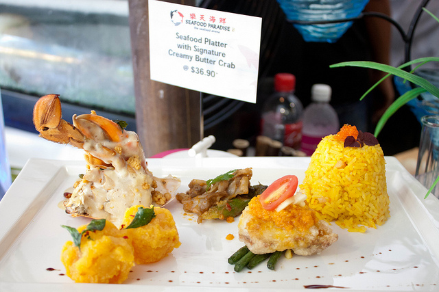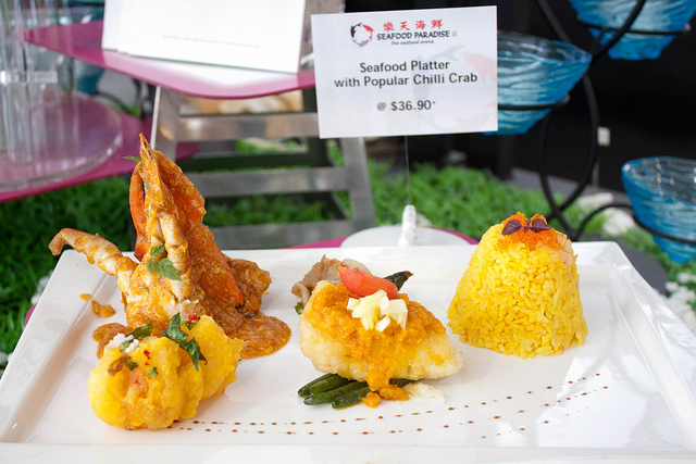 Seafood Paradise's outlet at the Singapore Flyer is the most well appointed among its four outlets. Coupled with its central location and pocket friendly prices of its ala carte dishes, even diners with reservations can expect to wait awhile to be seated on weekends and holidays.If I am to order just one dish to go with rice, it has to be their signature Fish Head Curry Casserole $18++ which is available only for lunch on a while stocks last basis. The fresh red snapper fish head is cooked to a family recipe with lots of coconut milk, okra, eggplant and deepfried beancurd pockets (taupok), making it a balanced one dish meal with protein and fibre. The rich and scrumptious gravy goes perfectly with a bowl or two of piping hot plain rice, or with a basket of deepfried Chinese buns (mantou) to mop up the concentrated gravy. The casserole is served atop a portable stove to keep the curry simmering and any (unlikely) fishy smells at bay. The portion is big enough for three or even four diners if no other dishes are ordered. However it can serve up to eight to ten aif other meat and seafood dishes are ordered as well.We ordered the prawn roll (ngoh hiang) $8.90++ and the cuttlefish with kangkong $14.90++ as appetizers to be shared among the four of us. Together with the fish head curry and rice, we had a very satisfying meal.…查看更多