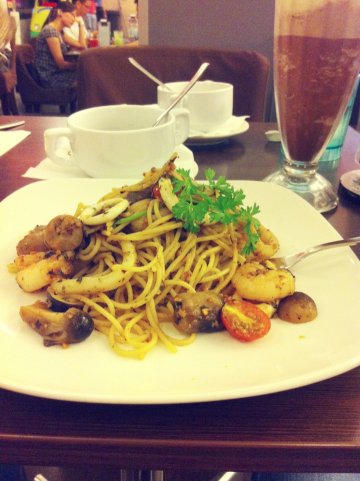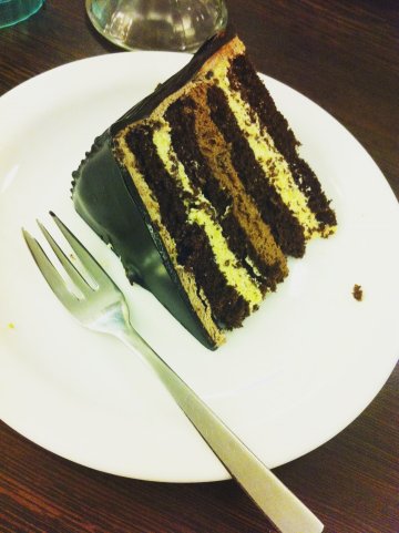 Chocolate IndulgenceFeeling down? Or you just want to celebrate? One slice of this chocolate and white chocolate-filled decadent cake is the solution. It is for those who love semi-sweet chocolates. You will love every morsel. This is an absolute comfort food. At $5.50 per slice, it is worth giving it a try. Thai Seafood SpaghettiI had ordered this for my daughter. Though there was an indication of only one chilli on the menu for this dish (all spicy dishes are indicated by either 1, 2 or 3 chillies with 1 being the least spicy), this was too spicy even for someone like me who has a lot of tolerance for spicy food. I have tasted dishes that are indicated by 3 chillies, but this was misleading. Furthermore, the spaghetti was under-cooked. It had a floury taste. I highlighted this to the waitress but was told that there was nothing she could do. I then requested for cheese, which was eventually given to me. Despite that, my poor girl could not digest the food. Sigh... wasted $13.90. Please note that the ratings I have given here is based on the taste of the cake. …查看更多