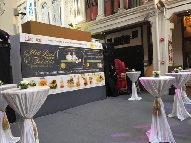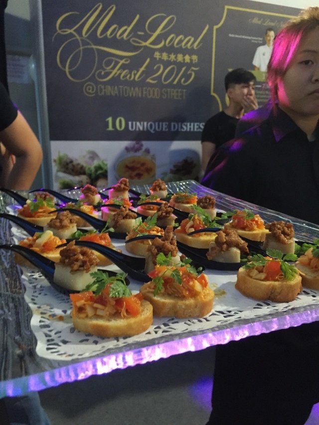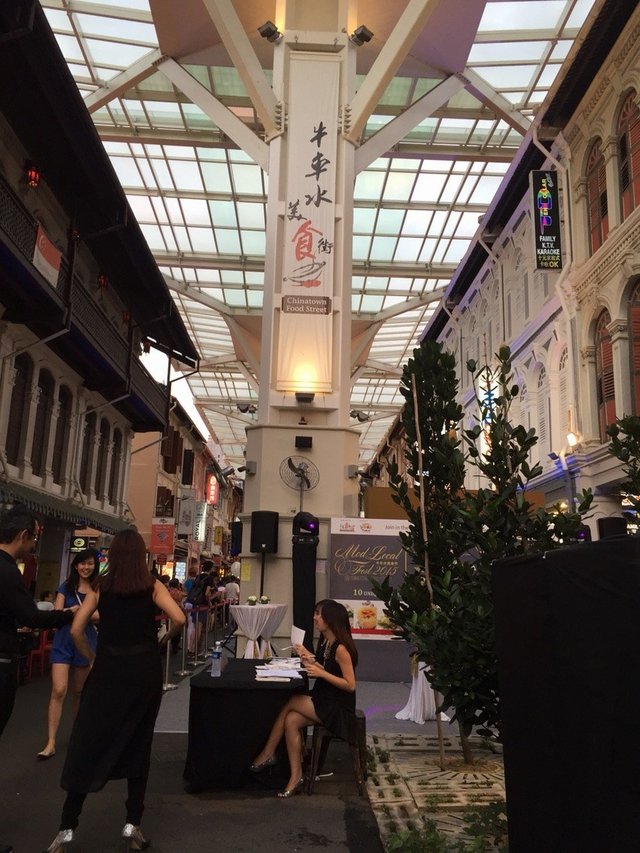 This year in conjunction with Singapore Food Festival 2015, Chinatown Food Street (which is managed by Select Group) hosts a gala dinner named “Mod-Local Noir” at the Chinatown Food Street on 17th July at $50 per person.Before the dinner starts, we are treated to a range of modern local tapas and drink.Chilli Crab on ToastAlthough only crab meat is used here, but it really brings one's mind to Chilli Crab with one mouthful.XO Carrot CakeAn atas version of the simple carrot cake with XO sauce on it. I feel that the carrot cake does not have the dried radish in it and too soft in texture.Soya Bean Milk Ice Blended with Grass JellyA refreshing take on the old school drink which some call it Michael Jackson which combines soya bean milk and grass jelly.It is a 10-course sit down dinner with pre-fixed seating arrangment. One can find each seat easily with name next to the plate. The place is tastefully decorated.Pandan Cake PopA door gift sweetly sponsored by MoofyPops.I have ordered Bulmers Original Cider which is served in a glass instead of a bottle as stated on the drink menu. It is stated $12 a bottle on the menu, but interestingly there is no bill. The staff should have informed the diners that the drinks are included in the meal, without additional charges. It is quite misleading with the menu given. The cider tastes quite water-down. The only good thing is that it is cold, which great to combat the heat. I somehow feel that the usual seventh month dinners performs better in service as those dinners usually have staffs going around refilling the soft drinks and ice cubes. This is not the case here. No such service.The dinner has dishes created by L♥ve 97.2FM DJ Violet Fenying and Chef Jimmy Chok (Consultant at JC Concepts). During the dinner, we also get to enjoy various performances.Fusion Rojak with Chilli Chocolate DipCrunchy Assortment of Rojak Ingredients served with a Specially Concocted Dip.DJ Violet Fenying's Creation.The spicy chocolate sauce adds spicy to the juicy fruits. But when mixes all up as a salad, the sauce becomes too watered down that one can barely taste the chocolate and spicy taste. Maybe it would be better to served chocolate coated fruits, covered with chopped nuts.Fragrant Chicken Rice Sushi RollSilky Poached Chicken Breast Meat & Crunchy Cucumber, a Unique Creation of Singapore's Heritage Hainanese DishIt is interesting having chicken rice in sushi form, but it crumbles easily. I think it would better if it is served with the minced garlic sauce or chilli sauce as one usually have these condiments for chicken rice.Kim Chee Roasted Duck Kuih Pie TeeGolden CUp filled with Savoury Roasted Duck and Kim Chee for that burst of flavour.Chef Jimmy Chok's Creation.Interesting combination which works quite well.Laksa Cigar RollSmoking Hot Cigar Roll stuffed with ingredients fried with Homemade Laksa Paste, served with Quail Egg and Laksa Dressing.Somehow the spring roll tastes quite salty to me. It is difficult to cut with the knife, so I use my hand for this dish.BKT Bisque with Pork WantonTender Wanton with Fragrant Pork Filling served with Peppery Bah Kut Teh BisqueThe wanton is quite meaty and juice. The soup is way too peppery and could not taste the essence of the pork in the soup.Chendol PopA Delightful Local Taste Ice PopsicleIt reminds one of Potong ice cream but with a homemade version way. It is served in a cup which I spend sometimes figuring out how to take it out. Would be better if the server has stopped to explain a bit, instead of rushing through. It melts quite fast anyway. I would prefer a stronger coconut milk taste.Charred Chicken and Beef Satay WrapFlavourful Meats layered with Crispy Beancurd Skin and Aromatic Peanut Sauce wrapped in Handmade Egg Crepe.It is quite difficult to eat as a wrap as the crepe is a bit small. Nice combination, although feels that the meat could be much tender and there is no char texture on the meat.Braised Duck Yam QuinoaSlow-Braised Duck Leg to reveal the Caramlised Essence of the Meat and Braising Stock paired with Healthy Quinoa Grains and an Enchanting Homemade Chilli Crumble.Chef Jimmy Chok's Creation.Of all the dishes served tonight, I feel that this is best out of all. I have never eaten quinoa which tastes so flavourful on its own. I could have bowls of it with just the sauce if I am not already so full. Even the aunties who are sitting next to me who have never eaten quinoa like it very much. Another surprise is the chilli crumble which looks like crispy fried chopped garlic at first glance. It has texture like very fine hae bee hiam (Spicy dried shrimps sambal), but without the spicy taste. It tastes addictive, which I wish it could have been served more and goes quite well with the tender and juicy duck meat.Superior-stock Baked Whole Prawn with Stewed NoodlesJuicy Whole Prawn skilfully cooked with Prawn Broth paired with Silky Smooth Stewed Noodles.I think this is worst dish out of the all the dishes served tonight. Firstly the prawns look rather dried up and not too fresh. There is barely any meat in the prawns. The noodles is cold and is too mushy in texture. It is quite jala after a few mouthful.Pulut Hitam Creme BruleeSteamed Black Glutinous Rice with Creamy Creme Brulee, a mixture of texture in every moutful.Chef Jimmy Chok's Creation.It is presented in a colorful way with smoke from dry ice under the dish and surrounded with colorful flowers. Great dessert but a bit heavy to finish with.The dinner ends with the gathering of the chefs who are involved in the dinner and to show appreciation for their hard work.Overall the dishes are not bad, although some may have left too long during the plating session and do not taste as good as expected. The place is quite humid and warm, which makes one difficult to concentrate on the meal.…查看更多