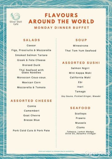 在Silver Shell Café享受完美用餐體驗。廚師們擁有嫻熟的烹飪技藝,為您奉上豐盛的自助餐或單點美食。 Silver Shell Café全天營業,專門為兒童準備了按比例縮小的自助餐檯,供應各色主菜、沙拉、三明治、水果和甜品。