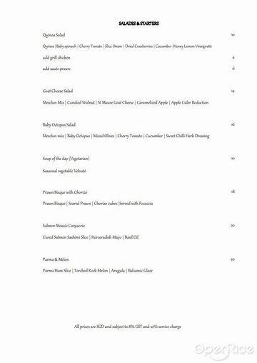山羊起司沙拉 / 烤多汁雞大腿 / 烤排骨 / 烤章魚腿 / 烤西冷牛排 / 蝦義大利麵