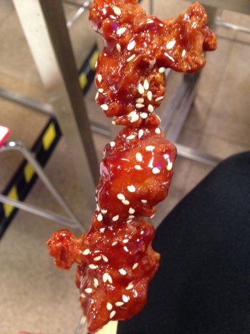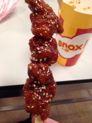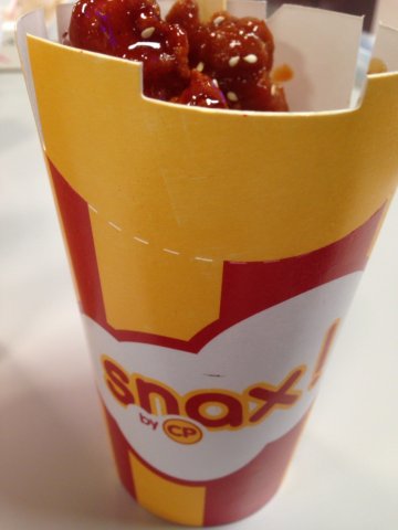 CP is a brand of popular ready-to-cook food snacks like their popcorn chicken as well as shrimp wonton. Anyway they recently launched a series of food kiosks, and i stumbled over one at Jem.I ordered Chicky Chix ($2.90) which consists of 2 sticks of fried chicken sticks, which i think is not too bad a deal. Upon ordering, it will be placed in a fryer and heated up. Then you choose from 3 sauces. I initially picked spicy and the staff asked if i want to pick another sauce for the second stick and i chose soy garlic. The chicken stick in soy garlic had some tangy taste. Meanwhile the spicy sauce one stays true to its name. Seriously very spicy. I like the chicken were sprinkled with sesame seeds, which contrasted nicely with the evenly lathered out sauce. The chicken is quite crispy and i think there is more skin than meat. The meat is very tender and succulent. Thumbs up. One can never expect anything lesser than that from this Thailand-based brand.…查看更多
