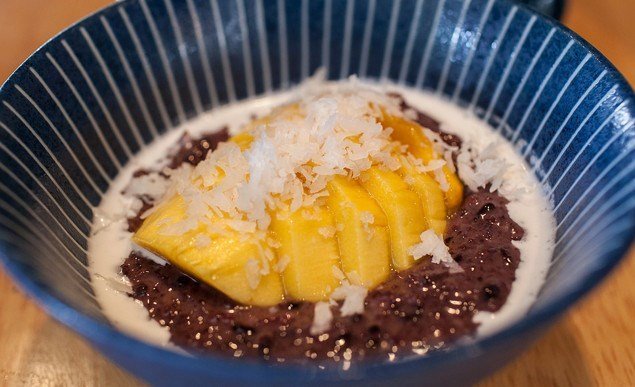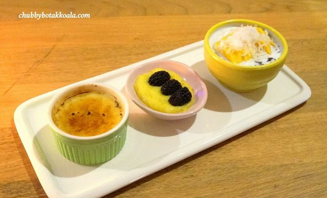 Ginger Creme Brulee, Passion Fruit cream & Black sticky rice with mango