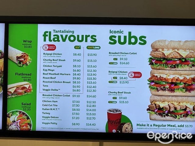 Subway (新加坡) 網址: https://s.openrice.com/eKbSB01hbm000 地址: Bugis Junction, 200 Victoria St #B1-25A, Bugis, Singapore 電話: +65 6835 9358