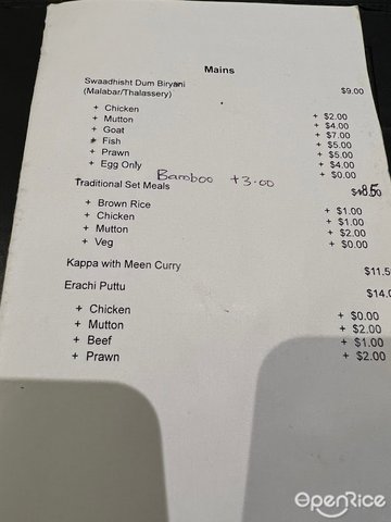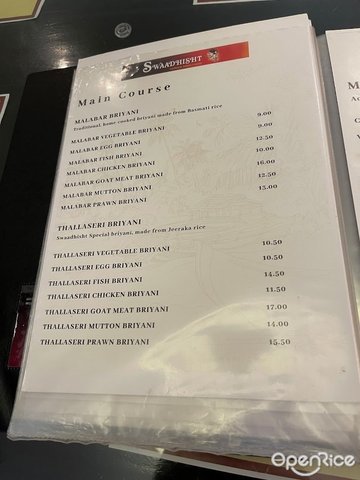 When it comes to biryani; Swaadhist serve me one of the best biryani's. Their dum biryani isn't very spicy, not too oily (or greasy); and has sufficient moisture (a proper dum biryani will always be nice and fresh with all the dum - steam); with well cooked, juicy and tender meat (lamb or chicken). The malabar biryani is their signature one and a must have. The Malabar Set Biryani comes with raita and chutney served on a banana leaf!They also serve Kappa Biryani. While it has Biryani in its name, it should not be mistaken as yet another variant, this one is made only of kappa (tapioca) and some mutton - without any rice! Kappa is a starchy root; and this preparation tastes and looks like dry indian potato sabji. An idea I used, which worked well for me was to have the Kappa biryani with roti.…查看更多