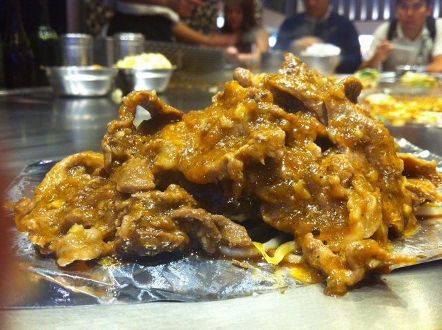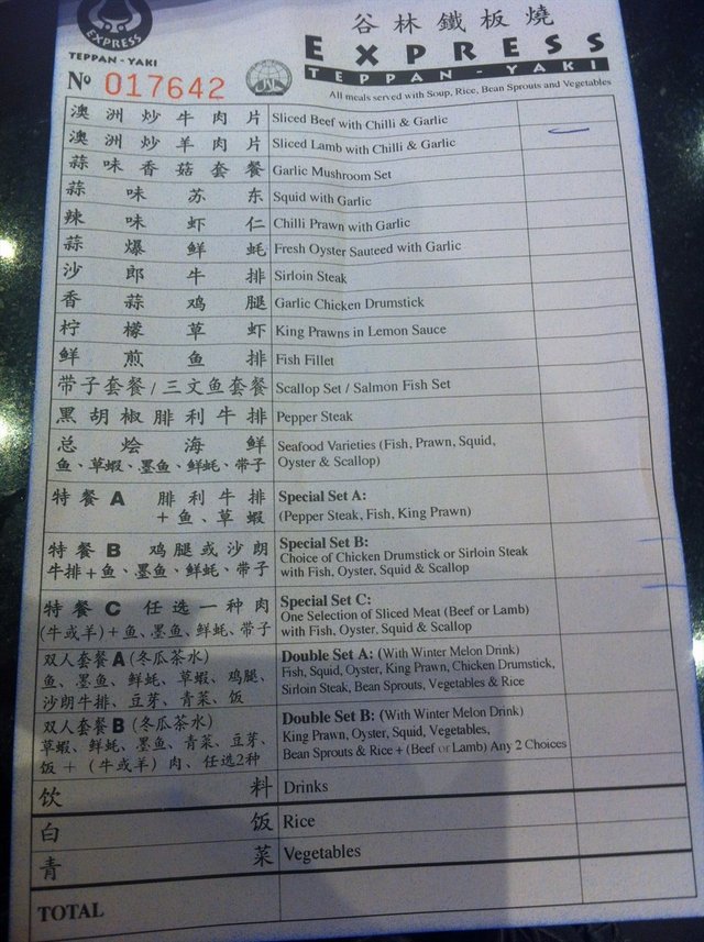 The food court at the AMK Hub is very crowded during dinner period and I have problems finding a seat. So I decide on this stall in order not to waste more time in looking for a table. Looking at the menu, I decide on the Sliced Lamb with Chilli & Garlic set which costs $10.90. After paying in cash at the cashier, the staff shows me to a counter seat with rice and soup already served on the table. The soup is quite lacking in flavours with some bits of cabbage in it. The chef at the counter double checks with me on my order and also asks if I would like to have chilli with the meat. He starts with stir frying the bean sprouts. The bean sprouts tastes quite flavourful and juicy. This is follows by the green vegetables which is done in a similar style and tastes great too. Lastly is the main course of sliced lamb which is sliced very thinly and tastes very tender. Overall it is a very filling and tasty meal. It is quite a show of cooking style by the skillful chef. The way he cleans up the hot propane-heated flat surface grill is quite smooth and swift.…查看更多