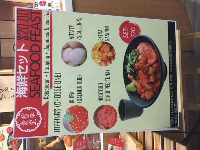 Teppei is a rather well known Japanese restaurant in Singapore. It is known for its 3 months in advance booking for its $80 multi course dinner. It has since opened Syokudo which offers Japanese dish at more pocket friendly prices. One of the dishes offered at this outlet is KaisenDon ($16.80) which is actually bara chirashi, a mixture of seasoned cubes raw seafood on top of sushi rice.Hotate KaisenDon ($17.80)It was KaisenDon topped with raw scallops on top, served with fresh wasabi. The seafood was fresh and buttery.Seafood Feast ($20)KaisenDon + 1 topping + 1 Japanese green teaThere are 4 choices for the topping : Hotate (Scallop), Negitoro (Minced Tuna), Extra Sashimi, and Ikura (Salmon Roe). I felt that the seafood feast was a great value meal.The Japanese green tea was rich and hot, great for a cold wet night.I had selected KaisenDon topped with Negitoro. It was served with freshly grated wasabi. The seafood was overflowing and fresh in taste. The raw seafood was cubed so it doesn't absorb too much sauce and become too salty. There was also crunchy tempura crumbles in it which gave it extra bit, as well as the juicy ikura.Overall the food was delicious and filling. Service was quick and friendly.…查看更多