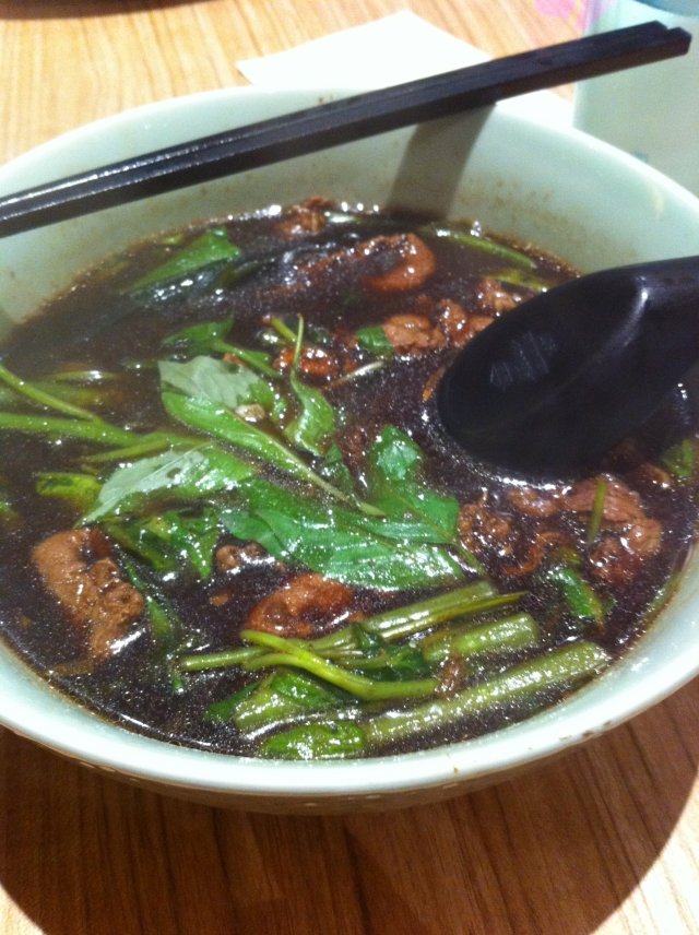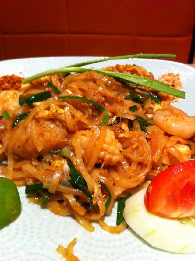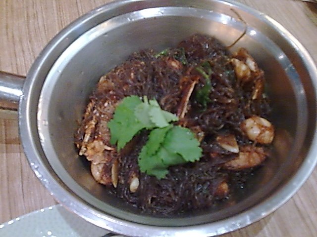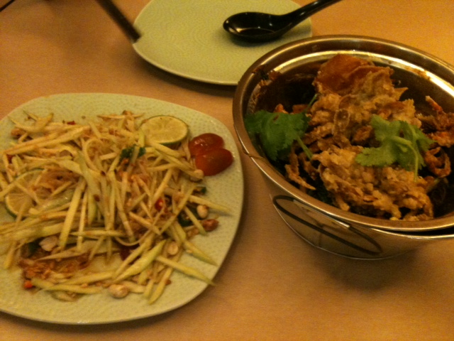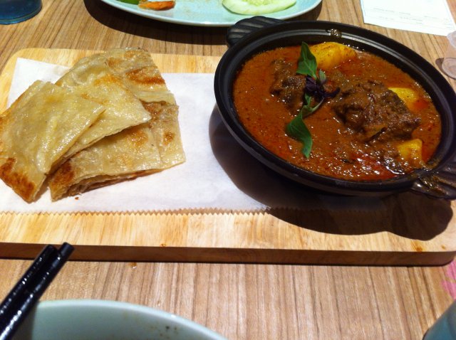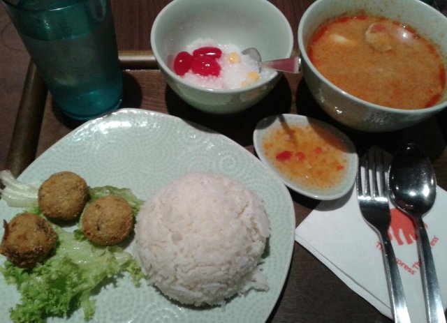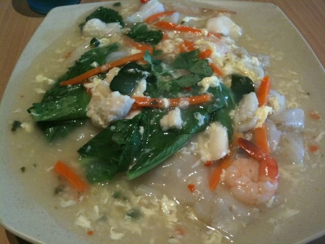 The Siglap branch of Thai Express is located on the ground floor of a low rise private apartment complex with 10+ parking lots (chargeable) for visitors along the compound's driveway. The restaurant's air conditioning is comparable to cineplex temperatures - welcomed on a sizzling hot afternoon but too chilly for the cloudy day we dropped by. We ordered 1 of the 3 promotional Sanook Sets (choice of tom yum soup, curry or stirfried dish) served with rice, appetizer and dessert, the massamun curry chicken with roti prata that was featured on the table display and the black pepper crayfish/slipper lobster with glass noodles.The Sanook Set was the best value at $8.90++. The tom yum soup had dory fish chunks, two shelled shrimps and several calamari rings. Taste was ok but nothing special. The 3 pcs of deepfried curry chicken balls were overcooked and tough. The sago and palm seed dessert was almost a reluctant inclusion, looked unappetizing and tasted bland with some sago beads hard and undercooked.The $12.90++ massamun curry which looked promising in the photo turned out to be the worst of the three items we had ordered. The prata was too oily and not evenly cooked (see photo) and seemed to have been reheated half heartedly in the microwave as it was not crispy at all. The curry was topped by a repulsive layer of oil.The black pepper crayfish glass noodles ($14.90++) looked unappetizing due to the cook's heavy handed use of black pepper sauce, was rather oily but tasted alright.The disappointing meal reinforced our impression that Thai Express has expanded too aggressively resulting in a sustained decline in the quality of its cooking. We didn't order any drinks (opting for water) or dessert and had change for our $50 note.…查看更多