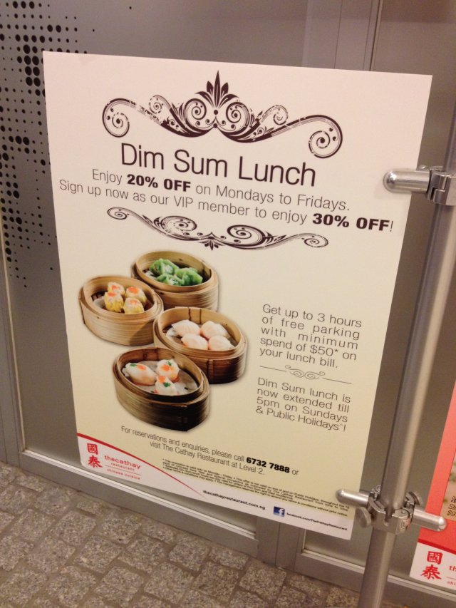 Cathay - a name synonymous with movies of the past era. What most people don't know is that Cathay actually operates a rather niche eatery in its premises which goes by the name of The Cathay Restaurant. Started in 1940, the restaurant served up European fare but switched to Chinese food in 1951 and was purportedly Singapore's finest Chinese restaurant at that time.Situated on the 2nd floor of the spanking new Cathay building, The Cathay Restaurant embraces the modern with its unpretentiously upclass decor yet retains his heritage by showcasing portraits of movie stars from the golden era. Retro-ish (if there's such a word) I must say.Doubled Boiled Shark's Bone Cartilage with Bamboo Fungus - I've always been a fan of shark bone soup and The Cathay Restaurant's rendition didn't disappoint. But then again, it wasn't outstanding either. The soup was tasty but did come across as a little too milky for my liking and left a slight starchy residue on my tongue after every mouthful, which I personally found a little unsettling.Deep Fried Spring Rolls - This is not your usual spring rolls because it comes with fatty pork, mushrooms and turnip as ingredients. Found it rather normal in spite of all the ingredients, probably due to the overall blandness but the skin was nice and crisp though.Siew Mai - Interestingly, the Siew Mai had this predominant mushroom taste owing to the fact that one of the ingredients in it was a sizable chunk of mushroom. This is something rather unique but I personally found it a little too "mushroomy", totally eclipsing the traditional pork taste that I associate with Siew Mai. Just an individual preference I guess.Pan Fried Pork Chop with Special Sauce - The pork chop was very well marinated as evident by the lightly sweet flavours each bite held. However, the pork was a tad on the chewy side which made eating difficult and there was a slight overuse on the amount of Chinese celery as I found the taste pretty evident, to the extent of being a little overwhelming.Poached Seasonal Vegetables - Funny how poached seasonal vegetables would turn out to have beancurd in it. Not that I'm complaining though. The beancurd was tasty but wasn't firm or silky enough to make the premium grade cut. The vegetables tasted like they had been blanched in boiling water and served up with gravy.Special Homemade Noodles with Mixed Seafood - I honestly don't see or taste anything special about the homemade noodles. Sure, it was chewy but that was it. Beansprouts and fresh average sized prawns graced the dish which tasted to me a little like Hor Fun due to the slightly smoky and starchy gravy. Having said that, the gravy was really too weak to make much of a difference, especially when the noodles were practically tasteless. I had to resort to adding soya sauce.Double Boiled Dried Apricot with Sea Coconut and Red Dates - If you get a kick out of having a sugar rush, then this dessert is probably for you. It was insanely sweet and I must say even for a sugar fanatic like me, I had a hard time trying to finish it. I attribute this to the extra sugar they added into the syrup on top of the sweetness from the already very sweet apricot.With a 1 for 1 offer from Standard Chartered, I only had to fork out about $55 for 2 pax, which I feel is rather reasonable given the acceptable quantity and decent quality of food. If the standard of the dim sum is anything to go by, food quality at The Cathay isn't exactly top notch, but its refined enough to warrant another visit. Not without a high percentage discount though.…查看更多