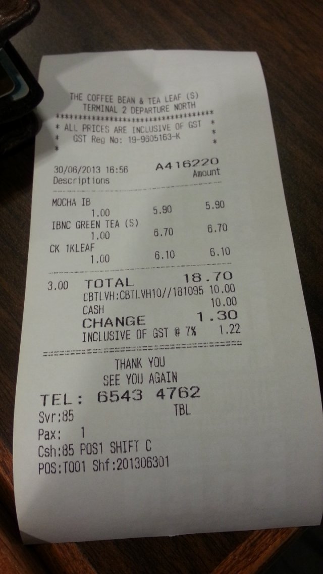 The Coffee Bean & Tea Leaf (新加坡) 網址: https://s.openrice.com/eKbSB01024000 地址: Changi Airport Terminal 2, 60 Airport Boulevard #026-017 (Departure Check-in Hall), Changi, Singapore 電話: +65 6543 4762