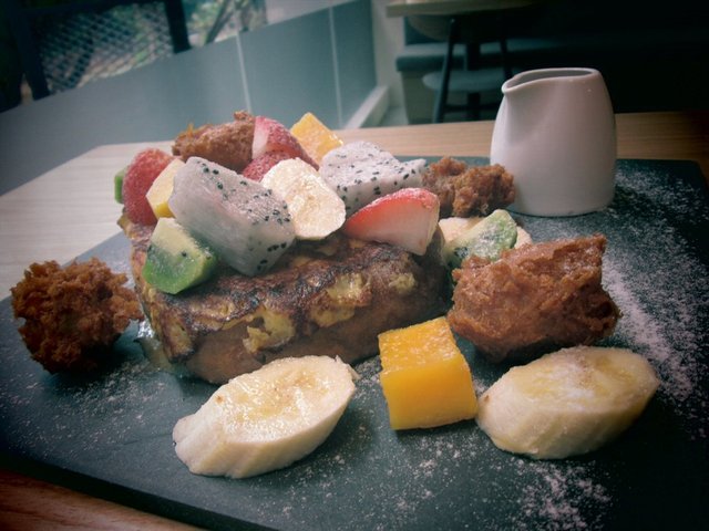 Tucked away in the stretch of shophouses along Bukit Timah sits The Missing Pan. Featuring an open kitchen concept at both levels with the first level showcasing their daily bakes and second level whipping up delish food serve up to our table tops. I like the chic and cozy setting of The Missing Pan, the perfect environment to spend your time with a cup of coffee accompanied by a plate of pastries or mains.I like how extensive their menu is, filled with variety of choices from the typical brunch food to mains like pasta and risotto.We ordered some munchies for sharing – Missing Wings ($10) and all time favorite Truffle Fries ($12). Missing wings turn out to be a little different from what i was expecting that is wings marinated with hot sauces. Instead it came out deep fried with its batter filled with spices and herbs. Crispy on the exterior with the crunch and juicy, piping hot in the interior. Not too bad an alternative i would say.These shoestring Truffle Fries are so addictive and awesome. Well seasoned with parmesan cheese and herbs tossed in truffle oil. Not only does it brings out a piquant truffle aroma, but i like how the texture of the fries are – the combination of crisp on the outer and soft in the inner.Instead of ordering one main each, we decided to order 2 of their Signatures, Crackling Pork Eggs Benedict ($18) & Beef French Toast Salpicon with Skewered Chicken ($23). It was something special to see Crackling Pork in the menu of brunch food, who would expect a combination like this. I find the pork a little too dry but at least it’s not too fatty, and the most important, your can hear the crackling sound as you bite off the skin. It’s also quite an intriguing use of orange flavored brioche in replacement of the typical white toast. You could really taste the orange flavor with a sweet orange scent, quite pleasant overall. The poached egg was a little disappointing though, besides the yolk being soft and runny, it lacks the lustre and seasonings. The taste and flavor of hollandaise sauce wasn’t really uplifting and the whites tasted really plain especially in the absence of hollandaise sauce.One of my favorite for the night is definitely this Beef French Toast Salpicon with Skewered Chicken. A very innovative twist made to a typical french toast. Juicy mushrooms and beef chunks well hidden within the french toast that was topped with tropical fruits and skewered fried chicken. A delish to satisfy both your sweet and savory cravings at the same time. The french toast has definitely not lost it’s natural beauty, the eggy taste! The pairing of french toast and stew within is indeed a delightful combination while the additional of fruits add a little sweetness and healthy touch to the dish.https://poohlovesfood.wordpress.com/2015/04/14/the-missing-pan/ for the full review.…查看更多