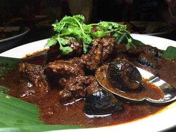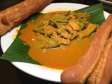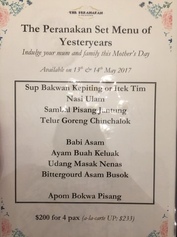Located at the second, one could not help but stared at the colorful decorated restaurant. The restaurant was beautifully decorated with various traditional cutlery all over the place, that one was afraid to use them for dining. This Mothers' Day weekend the restaurant would be having a special The Peranakan Set Menu of Yesteryears (S$200++ / 4pax) which consisted of the following dishes :Sup Bakwan Kepiting Rich broth of crabmeat/pork/prawn balls with bamboo shoot The meatball was juicy but one could not really taste the crabmeat and prawn in it.or Itek TimTender duck steamed with kiam chye and sour plumsAlthough there was the distinct salted mustard's taste, the soup was not too salty and the duck was quite tender.Nasi UlamA spectacular dish of rice with raw herbs, vegetables, minced fish and salted fish.The dish was served at room temperature, as it was considered a salad kind of dish.The dish was presented in a heart shape, to show the love to mother. Crunchy and savoury that one could not taste the salted fish in it.Sambal Pisang JantungBanana blossoms were used in this dish. To eat this dish, just scoop the mixture with the Bitternut cracker. The spicy, savoury and tangy taste of the mixture, balanced the bitterness of the cracker. It was a party in the mouth.Telur Goreng ChinchalokSavoury homestyle omelette with chinchalok melakaIt was a simple dish, pan fried omelette served with fermented shrimp sauce. But it tasted very appetizing. Babi AsamBraised Pork Cheeks in a Tangy Tamarind SauceThe meat was tender which soaked up the flavours rather well. Although it was asam dish, it was not too sourish.Ayam Buah KeluahA true blue peranakan dish. Stewed with chicken from great grandma's recipe.Buah Keluah is a poisonous fruit which can be made edible by correct methods of cooking. To eat it, one had to use the tiny spoon to scoop out the mashed filling which packed in the nut. It was buttery in taste without any bitterness. The chicken which served with it was quite tender too.Udang Masak NenasThe prawns were cooked in curry with pineapple. The gravy was tangy and slightly spicy. The prawns were fat and juicy.Bittergourd Asam BusokThe dish was a rare find. There was none of the usual bitterness while retaining the distinct bitter gourd's taste and shape. The dish was served with you tiao ( deep fried dough) which one could tear it into pieces to soak up the gravy. Dessert was supposed to be Apom Bokwa Pisang but was not available. Instead we had Kueh Dadar. The skin was thin and soft, while inside was packed with juicy coconut filling.…查看更多