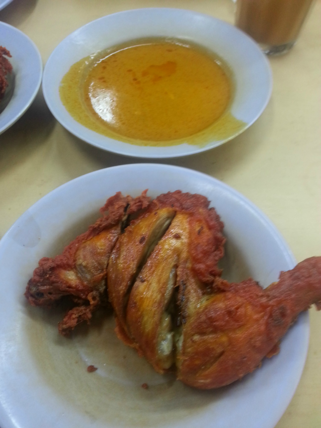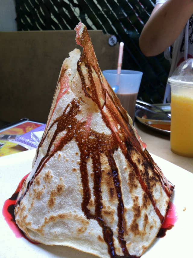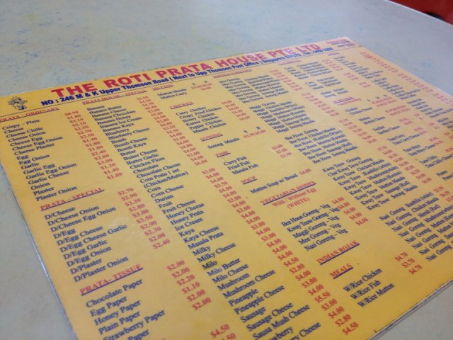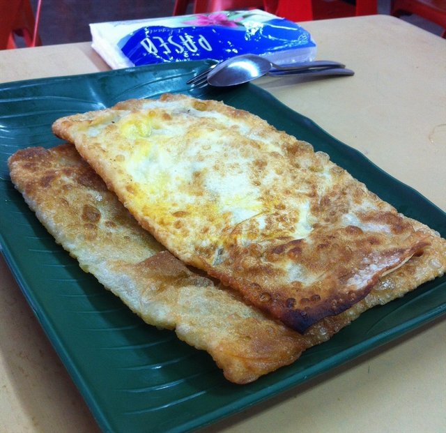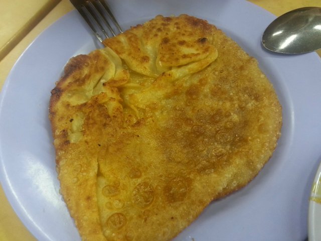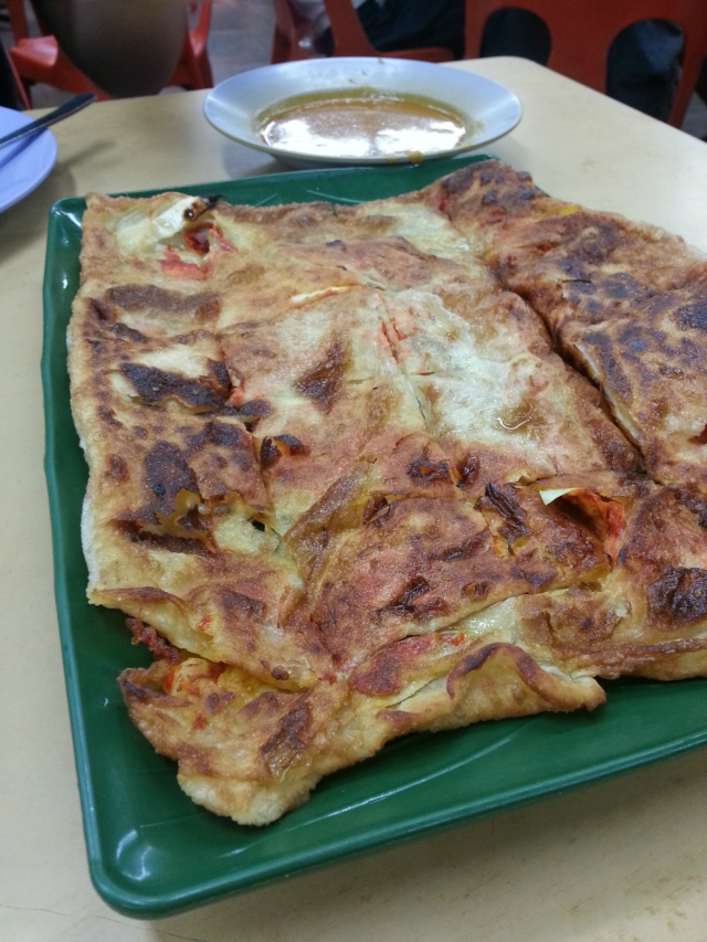 I often see good business at this roti prata place and decide to come here to have a bite before lesson. I find myself sitting at a empty table with nobody coming over to serve me. In the end, I help myself to a menu at the next table. The menu is huge with lots of variety of roti prata. From the simple plain roti prata at $0.60 to fancy fruit roti prata to bomb roti prata to pizza prata. There is also mutton soup, fried maggie mee, fried rice and Biriyani dishes. It is quite awhile before I finally catch the attention of a server to place my order. After serving the food, the server gives me a bill which one has to go to the cashier for payment.Chicken Cheese MURTABAK ($6 /small)The serving is in average size although I have ordered a small one. It is served with a small dish of curry. The prata is very crispy, filled with shredded chicken and meltd cheese inside. It kind of reminding me of a super thin skin curry puff. The roti prata has a rather deep fried texture with its super crispy feel. Some may feel that it is quite jelat eating this.Teh Cino ($1.50/ Iced)It is the local version of tea latte. One can see the layers of milk and tea separated. The milk part actually tastes quite sweet, while the tea is unsweeted. So when mixed together, it actually tastes quite nice and refreshing.Overall the food is not bad, but one has to take it easy for its slow service. For such a big place, there is only 1 person taking order and another serving the food. So don't be surprised if one cannot find a clean table.…查看更多