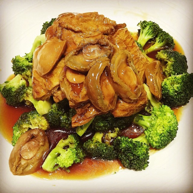 Braised 10 Head Abalone with Gluten & Greens (红烧豆根十头鲍)
