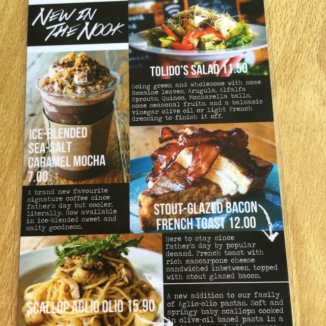 Ondeh Ondeh PancakesHaving been to Tolidos several times, not once have I been disappointed, as it just National Day last month, Tolidos decided to make Ondeh Ondeh pancakes which were a novelty special. The reviews for it was so overwhelming that they decided to keep it on their regular menu and I'm glad that they did. The pancakes had a strong coconut aroma and were light and fluffy, just like their regular buttermilk pancakes. Their vanilla ice cream is probably of the commercial sort but paired with the gula melaka sauce. I had to give both thumbs up for this dish. Prawn Aglio Olio (non spicy)The noodles were al dente and weren't too salty. When you order this dish, the staff will ask you if want it spicy or not. The prawns were crunchy but didn't seem entirely fresh. Maybe fresh-frozen? Nonethless, it was still a nice plate of pasta.Cereal Bacon rollsThis is one of their famous side dishes. Take note, there's a toothpick in them. The bacon was crispy with a cube of cream cheese in the center. It was very sinful but yummy. However, even though it was very enjoyable, I feel that the price is too steep for just a few pieces of bacon with a cube of cream cheese wrapped in it.Oreo MilkshakeTolidos is famed for their coffee so I decided to try their milkshake. Disappointing, they didn't blend it well enough and there were huge pieces or should I say, whole Oreo cookies at the bottom of the cup. It felt like I was drinking pure milk with vanilla ice cream. Com'on guys, you guys can do latte art perfectly well, how much more or less effort is required to blend a couple of scoops of vanilla ice cream with oreo cookies?All in all, I still enjoyed my experience at Tolidos and I will always keep coming back with highly expectations. My only gripe is they have such a small seating area, and I always have to sit outside and then get moved into the indoor/air-conditioned seat halfway through my meal. Then again, I do visit them on weekend afternoons.…查看更多