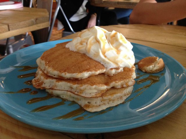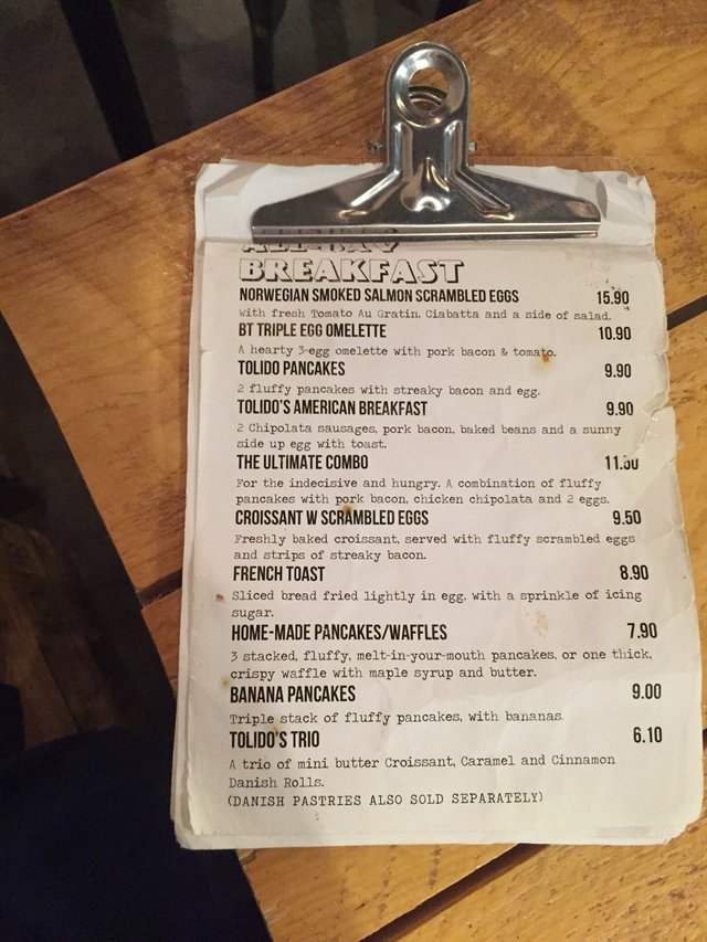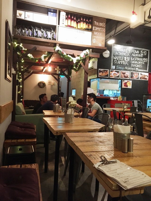 Ondeh Ondeh PancakesHaving been to Tolidos several times, not once have I been disappointed, as it just National Day last month, Tolidos decided to make Ondeh Ondeh pancakes which were a novelty special. The reviews for it was so overwhelming that they decided to keep it on their regular menu and I'm glad that they did. The pancakes had a strong coconut aroma and were light and fluffy, just like their regular buttermilk pancakes. Their vanilla ice cream is probably of the commercial sort but paired with the gula melaka sauce. I had to give both thumbs up for this dish. Prawn Aglio Olio (non spicy)The noodles were al dente and weren't too salty. When you order this dish, the staff will ask you if want it spicy or not. The prawns were crunchy but didn't seem entirely fresh. Maybe fresh-frozen? Nonethless, it was still a nice plate of pasta.Cereal Bacon rollsThis is one of their famous side dishes. Take note, there's a toothpick in them. The bacon was crispy with a cube of cream cheese in the center. It was very sinful but yummy. However, even though it was very enjoyable, I feel that the price is too steep for just a few pieces of bacon with a cube of cream cheese wrapped in it.Oreo MilkshakeTolidos is famed for their coffee so I decided to try their milkshake. Disappointing, they didn't blend it well enough and there were huge pieces or should I say, whole Oreo cookies at the bottom of the cup. It felt like I was drinking pure milk with vanilla ice cream. Com'on guys, you guys can do latte art perfectly well, how much more or less effort is required to blend a couple of scoops of vanilla ice cream with oreo cookies?All in all, I still enjoyed my experience at Tolidos and I will always keep coming back with highly expectations. My only gripe is they have such a small seating area, and I always have to sit outside and then get moved into the indoor/air-conditioned seat halfway through my meal. Then again, I do visit them on weekend afternoons.…查看更多