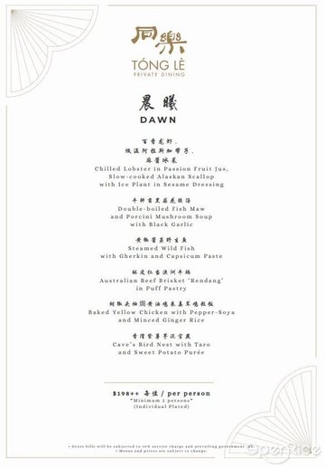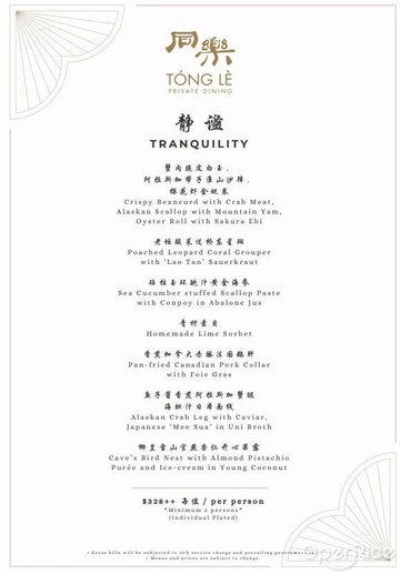 There're only 2 revolving restaurants in Singapore. Tong Le Private Dining is one of only two restaurants in Singapore offering the fabulous dining experience in a revolving tower, diners could complete a panoramic tour of the Marina Bay area within two short hours.Something different about this restaurant - They don't serve ala carte menu. Their menu offers a variation of prefixed menus that changes every 2 weeks. This is good as the chances that you get to eat the same food items is very slim if you dine there a few times in a year.Braised Cave Bird's Nest with Bamboo Fungus, Crab Meat & Roe:The presentation was superb, with the soup served in a bowl atop a burner. This made the whole bowl look really big, indeed the serving of the soup was generous and that certainly improved my appetite! The soup was full of flavour with generous portions of the bird's nest in the middle! The burner kept the soup hot and bubbling throughout! Yummy!!!Braised Fragrant Rice with Fish Maw & Foie Gras accompanied with Pan-Seared Hokkaido Scallop:This is one of the best scallop I've ever had!! The exterior was crispy and the moment you bite into it, the burst of fragrance from the scallop fills your palette!!! I really don't know how to describe it anymore.. It's really fantastic scallop!! But the rice itself was so-so... couldn't really taste the foie gras anywhere... Overall this dish was saved by the twins.For full review and photos, please visit:http://summerlovestoeat.blogspot.sg/2015/03/set-dinner-at-tong-le-private-dining.html…查看更多