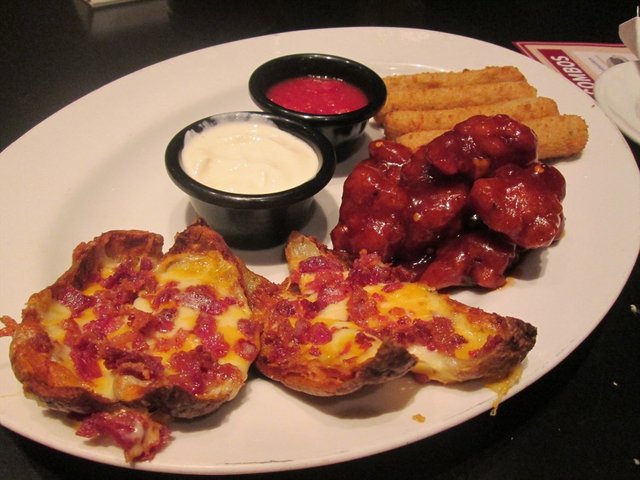 Tony Roma's started in 1972 in North Miami. The restaurant is known for its ribs. Currently it has outlets in 27 countries. In Singapore, there is 2 outlets - Orchard Central and Suntec City. The orchard central outlet is decorated in a US diner style with its wooden furniture and booth seats. After placing order, cultery are placed on the table. I like that the knife and fork are wrapped in a holder, something which one seldom see these days. A loaf of piping hot and soft bread is served with garlic butter. Cute having the bread served in a cone shaped paper wrap.Appetizer Sampler ($18.90++)The dish is consists of Spicy BBQ Boneless Bites, Potato Skins and Mozzarella Sticks with sour cream and marinara sauce. I like the Potato Skin which is thin and cheesy. Topped with sour cream, it tastes even better. The Mozzarella Stick is also very good with the huge amount of soft chewy cheese filling inside. But Spicy BBQ Boneless Bites is a disappointment with its over sourness taste.Ribeye Steak and Rib Combo ($38.90++)The dish is served with two choices of cole slaw, baked potato, mashed potatoes, french fries, ranch style beans, rice, broccoli or corn on the cob. The mashed potatoes is very tasty as the onions inside the mashed enhances its taste. Topped with cheese, bacon and chives, it tastes even better. The broccoli is well cooked and is a great choice since it is a superfood. The rib is very tender and juicy. But the steak is a bit tough and has quite a bit of fatty parts. Currently there is a Standered Chartered credit card promotion where a jar of soft drink costs $10 with a order of steak combo. The jar is quite huge and between the 2 of us, we cannot finish the drink.Overall the food is quite filling and tasty. Service is great too. Although it is 10.30pm (way pass the closing time which 10pm), the staffs do not make us feel pressured to leave the place.…查看更多