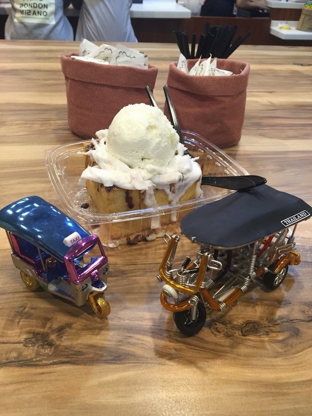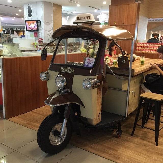 Tuk Tuk Cha is a small cafe offering thai style desserts and drinks. Currently it has 4 outlets in Singapore. One of the outlets is located in Suntec City Mall. The cafe was small with a small dine in area of about 10 paxs. One would not miss the tuk tuk vehicle which front the dine in area when passing by the shop.Aloha Coconut Shibuya Roast ($10.80)It was served with coconut ice-cream, shredded fresh coconut, and honey, on top of the crispy toast. Although the toast looked quite thick, it sliced easily as it was quite crispy. The toast itself was quite yummy being buttery and honey sweet. The ice cream was quite milky and rich. Overall quite a delicious combination.Thai Milk Tea ($2.80/regular), Homemade Lemongrass ($2.80/regular)Not sure if the toast was too sweet. We felt that the drinks were just nice and not too sweet.Overall the food was great. Service was great too. Although we were the last customers left, the staffs did not chase us out.…查看更多