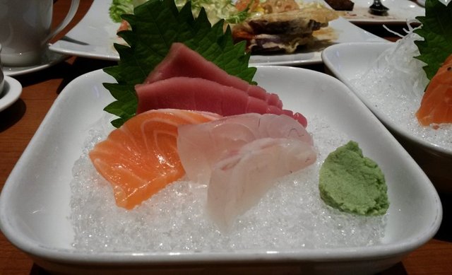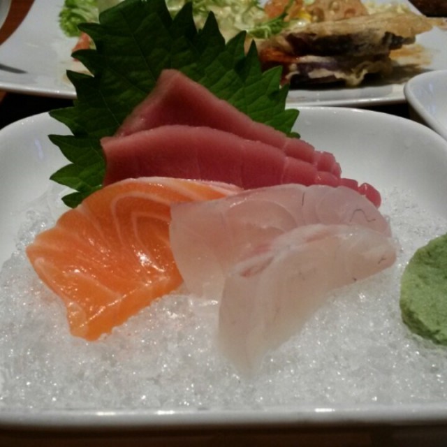 Trio Sashimi with good grades of Tuna, Salmon and Fugu Fish