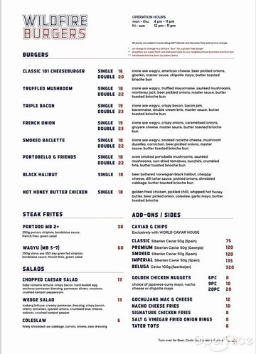 Wildfire Burgers (新加坡) 網上訂座即賺Rice Dollars 網址: https://s.openrice.com/eKbSB01Ik0200 地址: Robertson Walk, 11 Unity Street #01-12, Mohammed Sultan, Singapore 電話: +65 8139 5952