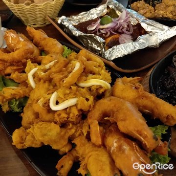 Kampung Signature Fish / BBQ Sambal Stingray / Chilli Crab / Mala Fried Crab / Kampung Durian Chicken / Kampung Satay Platter